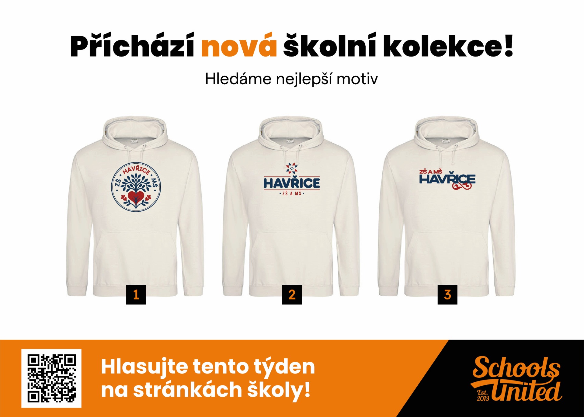 Naše škola chystá ve spolupráci se společností Schools United vlastní kolekci oblečení. Je ale potřeba vybrat motiv, který se Vám bude líbit nejvíce. Každý z návrhů, který v hlasování získá více než 30 hlasů, bude zařazen do prodeje. Tak hurá do toho!