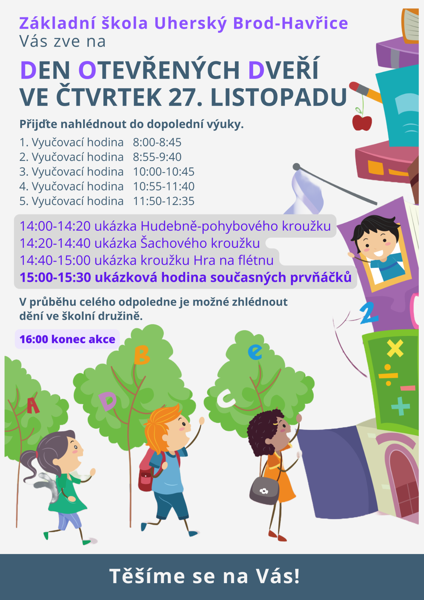 srdečně Vás zveme na DEN OTEVŘENÝCH DVEŘÍ, který se bude konat ve čtvrtek 27. listopadu. V průběhu dopoledne nahlédněte do výuky a v odpolední části se přijďte podívat na ukázky zájmových kroužků, dění ve školní družině, prohlédněte si prostory školy nebo si popovídejte s učitelkami i s vedením školy. Pokusíme se odpovědět na Vaše dotazy a poskytneme Vám potřebné informace. Přijďte se podívat do malé rodinné školy, ve které klademe důraz na vzájemnou spolupráci a pocit sounáležitosti.