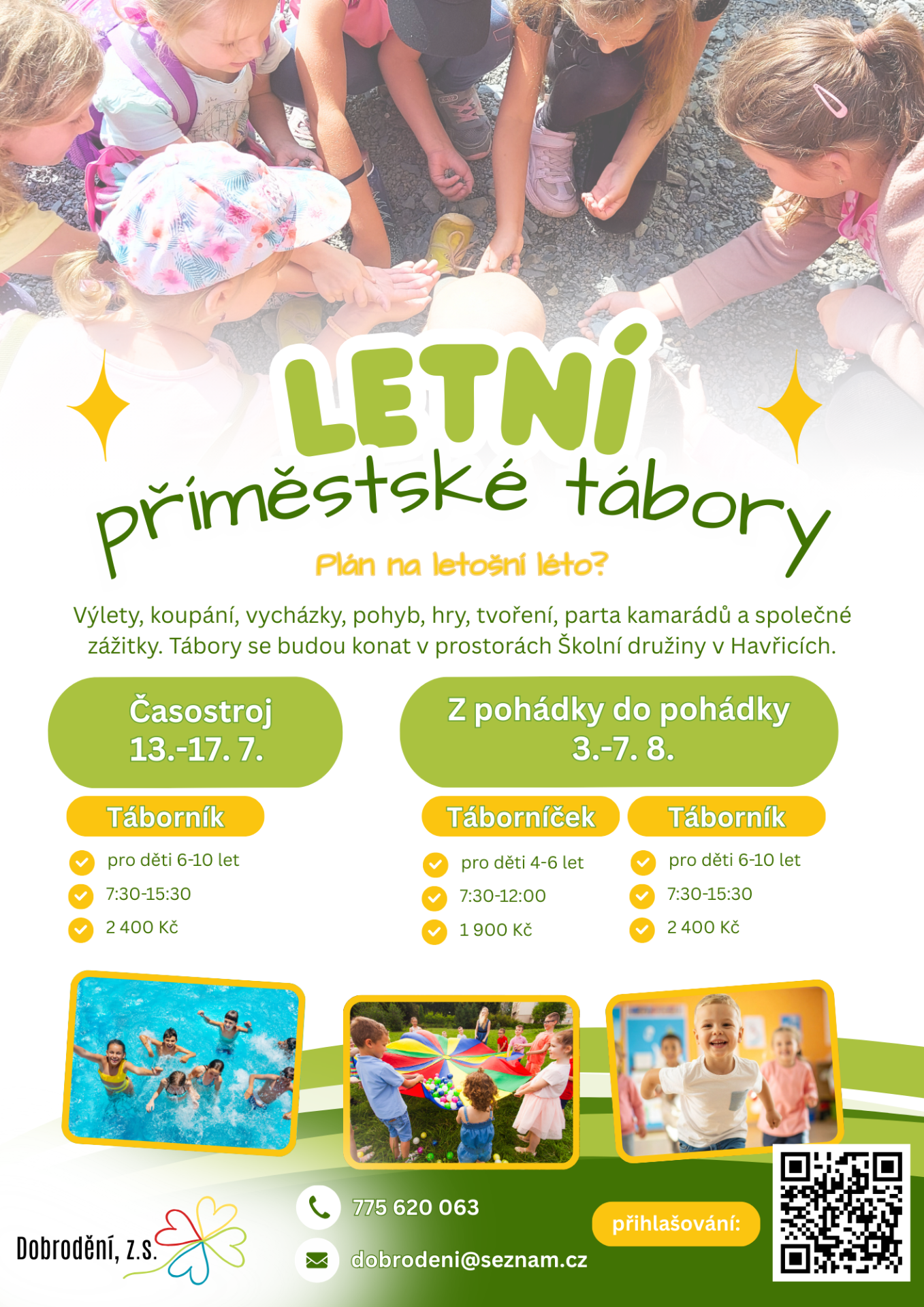 Hledáte ideální možnost, jak zabavit děti o prázdninách? Pestrý program pod vedením zkušených vedoucích v místě Vašeho bydliště může být ideální volbou. Zapsaný spolek Dobrodění bude v době letních prázdnin pořádat sérii příměstských táborů v areálu naší školní družiny. Možnost přihlášení skrze QR kód na přiloženém plakátu.